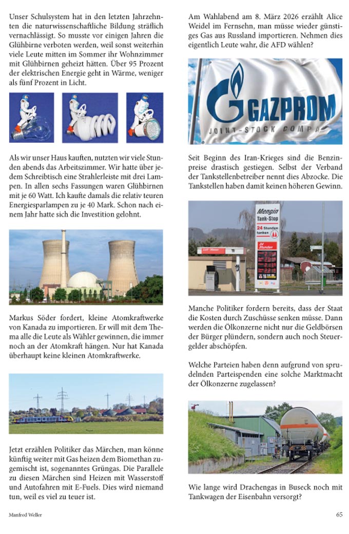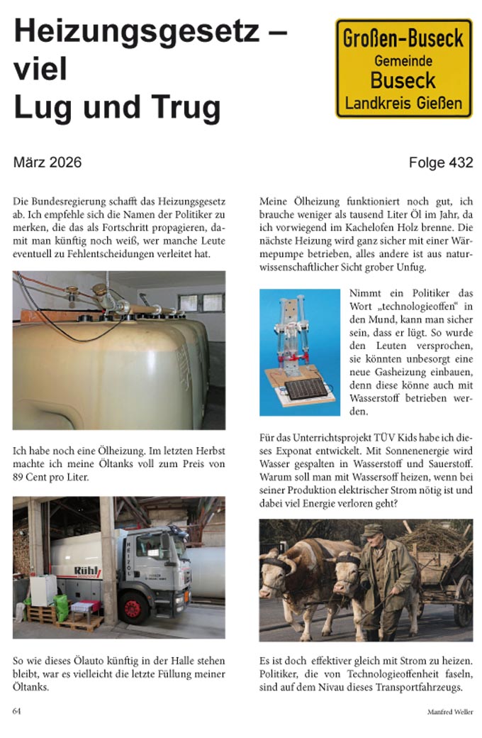 2026 | Folge 432 - Heizungsgesetz - viel Lug und Trug | Folge 431 - Wie lernt man Politik? | Folge 430 - Es war einmal ... ein märchenhaftes Großen-Buseck | Folge 429 - Radio war das Hörrohr in die weite Welt | Folge 428 - Strom kann man nicht auf Vorrat produzieren | Folge 427 - Hägar der Schreckliche räumt in Großen-Buseck auf |Folge 426 - Über den Dächern von Nizza? - Nein - Großen-Buseck | Folge 425 - Um 1900 gab es fast doppelt so viele E-Autos wie Benziner | Folge 424 - Busibert ist dem Busecker Wappen entsprungen | Folge 423 - Auf dem Weg zum SMART-Home | Folge 422 - Wirtschaftswunder - ich erlebte, wie es stetig aufwärts ging |