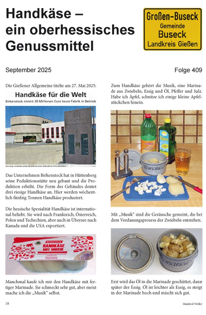 2025 | Folge 409 - Handkäse - ein oberhessisches Genussmittel | Folge 408 - Wir haben in Buseck zu viele Lager! | Folge 407 - Alte Chemie in Giießen wird doch nicht saniert | Folge 406 - Technologieoffenheit - Unwort des Jahres | Folge 405 - Nach dem Pflastern brauchte ich ein Pflaster | Folge 404 - Viele Schafe Wiesen was sie Wolle | Folge 403 - Warum lassen sich Industrie und Handwerk das gefallen?! | Folge 402 - Künstliche Intelligenz ist besser als bürokratische Dummheit! | Folge 401 - Raben faszinieren in Märchen und in der Natur | Folge 400 - Bier - Grundnahrungsmittel, Genuss- und Kultgetränk | Folge 399 - Begrüßungsrituale kulturell - angeborenes Verhalten? | Folge 398 - Von der Spielwiese zur Nahrungsquelle für Insekten | Folge 397 - Feuerwehren des Landkreises Gießen feiern und löschen | Folge 396 - Spiesachen bewegen sich mit Mechanik | Folge 395 - Endlich wird das Schwimmbad wieder geöffnet | Folge 394 - Alles in Butter | Folge 393 - Wie lebten die Menschen vor 700 Jahren in Großen-Buseck? | Folge 392 - Faszination alter Bilderbücher und Sammelalben | Folge 391 - Vom Heckendamm bis zur Befestigungsanlage Schwimmbad | Folge 390 - Ein Naturkreislauf war früher in der Landwirtschaft üblich | Folge 389 - Was essen Pflanzen? | Folge 388 - Erde ist mehr als einfach nur Dreck | Folge 387 - Vergib uns unsere Schuld(en)! | Folge 386 - Großen-Buseck - Größe ist eine Frage der Perspektive | Folge 385 - Fahren bald Wasserstoffzüge durch Buseck? | Folge 384 - Der Globus quietscht und eiert | Folge 383 - Rückepferde - sanftmütige Waldarbeiter | Folge 382 - Mystify-Science-Circle am 1. April um 14.00 Uhr im Kulturzentrum | Folge 381 - Die Pavillonschule für 9. Schuljahr und den Spielmannszug | Folge 380 - Moped- und Mofaautos erobern Busecker Straßen | Folge 379 - Aber bitte mit Sahne! | Folge 378 - Tracht war die Uniform der Leute im Dorf | Folge 377 - Traumjob - Gehalt für Nichtstun und Wohnung frei | Folge 376 - Ein Mammutbaum ist eine Zierde für den Garten? | Folge 375 - Großen-Buseck früher und heute | Folge 374 - Ohne Moos nix los - hast Du genügend Mäuse? | Folge 373 - Die Gemeinde regelt alles? | Folge 372 - De Rudi häächt die Pauk | Folge 371 - Dank DIN A ist der Papierkram einfach zu handeln | Folge 370 - Was ist neu 2025? Wird es besser oder nur teurer?