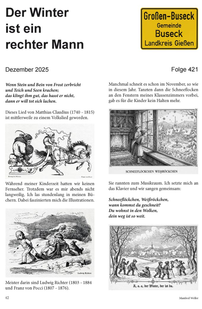 2025 | Folge 421 - Der Winter ist ein rechter Mann | Folge 420 - Der Weihnachtsbaum vertreibt die Wintergeister | Folge 419 - Absolute Sicherheit auf Weihnachtsmärkten gibt es nicht! | Folge 418 - Advent - Sehnsucht nach Licht - aber es gibt Hoffnung! | Folge 417 - Apfelbäume sterben langsam - aber es gibt Hoffnung! | Folge 416 - Vom Sperrmüll zum Moto Cross in Beuern | Folge 415 - LEGO erobert Großen-Buseck | Folge 414 - Bürokratieabbau geht nicht ohne mehr Personal | Folge 413 - Feuerwehr Oldtimer am 28. Juni 2026 in Großen-Buseck | Folge 412 - Peterchens Mondfahrt - Anstoß für Mondlandung? | Folge 411 - Glasfaserausbau - erhebliche Probleme, aber es geht doch! | Folge 410 - Kartoffeln - Grundnahrung für Mensch und Tier | Folge 409 - Handkäse - ein oberhessisches Genussmittel | Folge 408 - Wir haben in Buseck zu viele Lager! | Folge 407 - Alte Chemie in Giießen wird doch nicht saniert | Folge 406 - Technologieoffenheit - Unwort des Jahres | Folge 405 - Nach dem Pflastern brauchte ich ein Pflaster | Folge 404 - Viele Schafe Wiesen was sie Wolle | Folge 403 - Warum lassen sich Industrie und Handwerk das gefallen?! | Folge 402 - Künstliche Intelligenz ist besser als bürokratische Dummheit! | Folge 401 - Raben faszinieren in Märchen und in der Natur | Folge 400 - Bier - Grundnahrungsmittel, Genuss- und Kultgetränk | Folge 399 - Begrüßungsrituale kulturell - angeborenes Verhalten? | Folge 398 - Von der Spielwiese zur Nahrungsquelle für Insekten | Folge 397 - Feuerwehren des Landkreises Gießen feiern und löschen | Folge 396 - Spiesachen bewegen sich mit Mechanik | Folge 395 - Endlich wird das Schwimmbad wieder geöffnet | Folge 394 - Alles in Butter | Folge 393 - Wie lebten die Menschen vor 700 Jahren in Großen-Buseck? | Folge 392 - Faszination alter Bilderbücher und Sammelalben | Folge 391 - Vom Heckendamm bis zur Befestigungsanlage Schwimmbad | Folge 390 - Ein Naturkreislauf war früher in der Landwirtschaft üblich | Folge 389 - Was essen Pflanzen? | Folge 388 - Erde ist mehr als einfach nur Dreck | Folge 387 - Vergib uns unsere Schuld(en)! | Folge 386 - Großen-Buseck - Größe ist eine Frage der Perspektive | Folge 385 - Fahren bald Wasserstoffzüge durch Buseck? | Folge 384 - Der Globus quietscht und eiert | Folge 383 - Rückepferde - sanftmütige Waldarbeiter | Folge 382 - Mystify-Science-Circle am 1. April um 14.00 Uhr im Kulturzentrum | Folge 381 - Die Pavillonschule für 9. Schuljahr und den Spielmannszug | Folge 380 - Moped- und Mofaautos erobern Busecker Straßen | Folge 379 - Aber bitte mit Sahne! | Folge 378 - Tracht war die Uniform der Leute im Dorf | Folge 377 - Traumjob - Gehalt für Nichtstun und Wohnung frei | Folge 376 - Ein Mammutbaum ist eine Zierde für den Garten? | Folge 375 - Großen-Buseck früher und heute | Folge 374 - Ohne Moos nix los - hast Du genügend Mäuse? | Folge 373 - Die Gemeinde regelt alles? | Folge 372 - De Rudi häächt die Pauk | Folge 371 - Dank DIN A ist der Papierkram einfach zu handeln | Folge 370 - Was ist neu 2025? Wird es besser oder nur teurer?